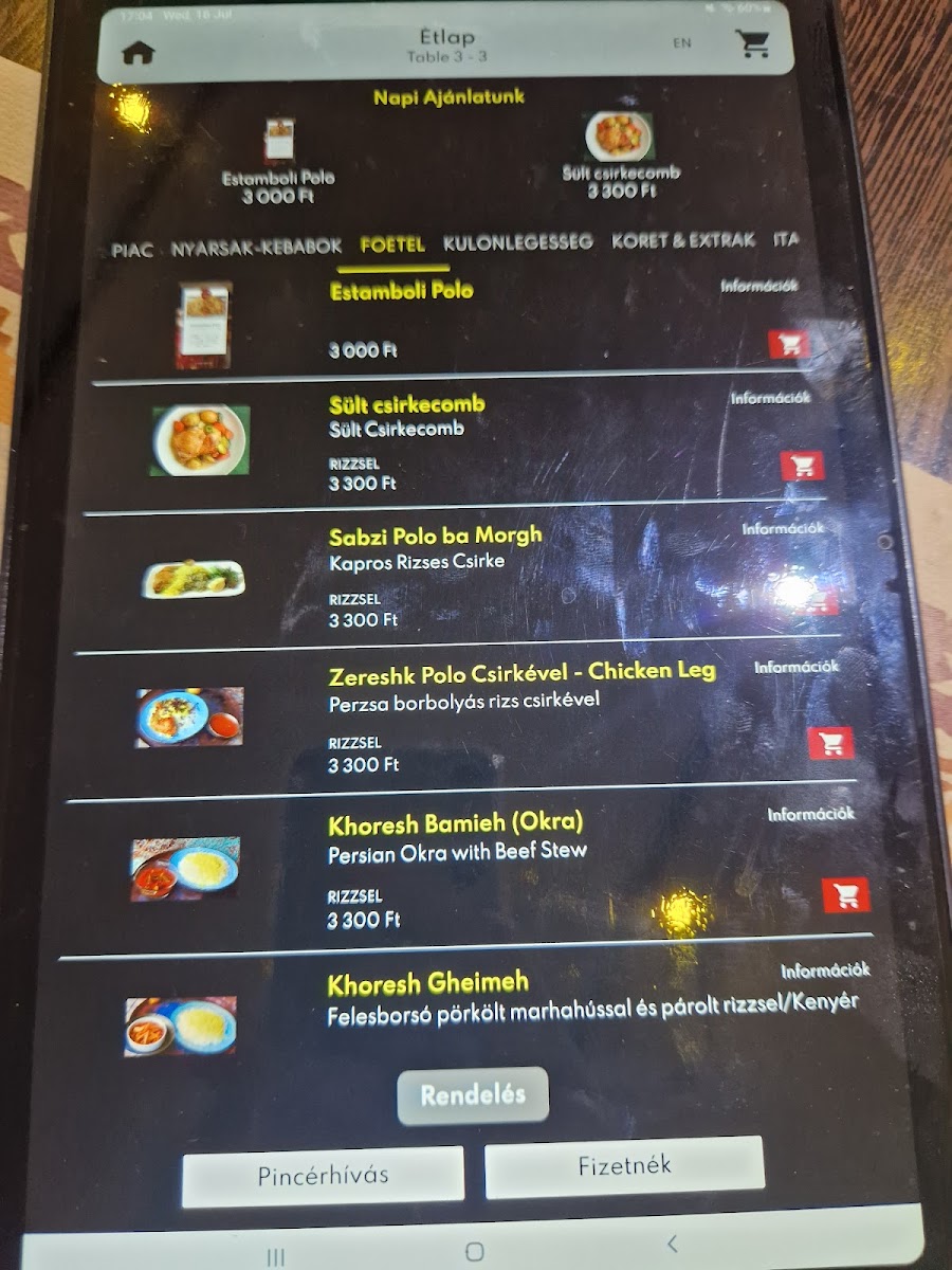 Lamb Shank boiled with special spices served with its seasoned sauce, and Persian dill/herbal rice Only weekends and alternative week. [HUN] Báránycomb speciális fűszerekkel fűszerezve,fűszeres mártással, perzsa kaporral /gyógynövényes rizzsel tálalvaCsak hétvégenként és alternatív héten.