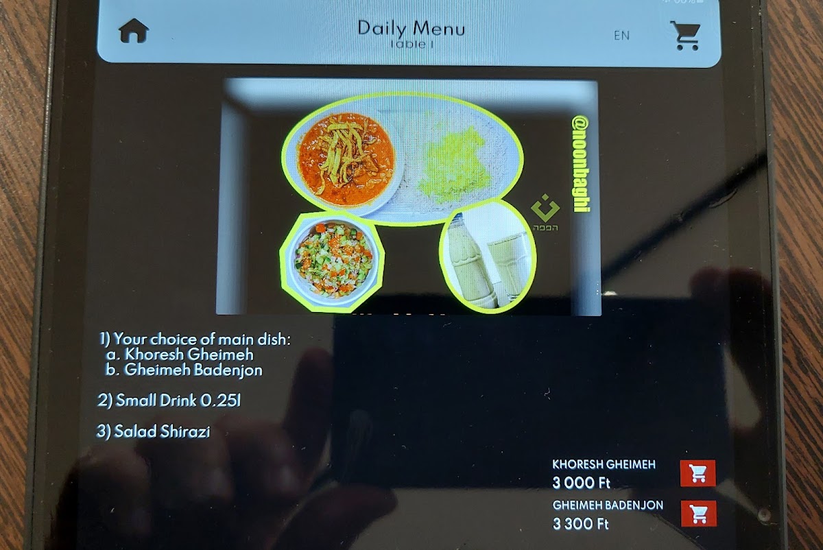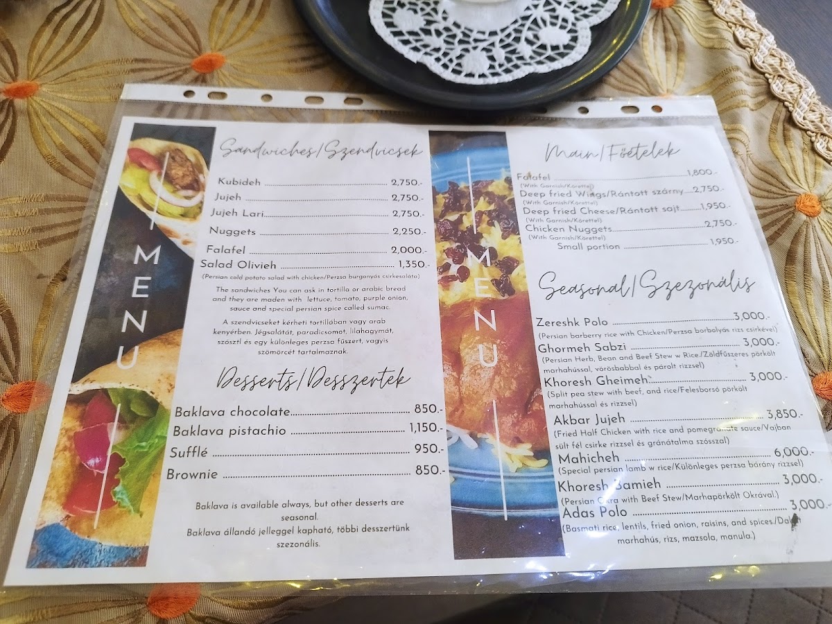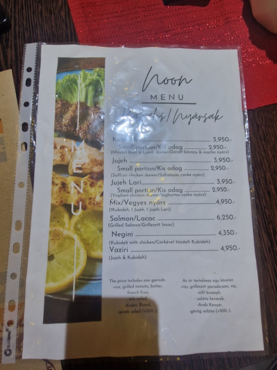 Noon Baghi Cafe & Restaurant offers a delightful selection of dishes that perfectly blend traditional flavors with a modern twist. For the main dishes, they offer hearty options like Koobideh Kabab and Koobideh Kabab Junior, as well as tender Joojeh Kabab and Joojeh Kabab Junior. The Negini Kabab stands out as another savory choice for kabab lovers. Appetizers and salads are equally impressive, with comforting bowls of Ash Reshteh soup, a variety of fresh salads like the NOON Salad and Greek Salad, providing a refreshing start to the meal. To quench your thirst, the menu offers drinks such as Lemonade (0.5L), Ayran/Doogh (0.5L), and popular soft drinks like Vimto (0.33L) and Lazez (290ml). For dessert, guests can indulge in sweet treats like Baklava, warm Sufflé, rich Brownie, and creamy Pohárkrém. With a diverse menu that caters to a variety of tastes, Noon Baghi Cafe & Restaurant is an excellent choice for those seeking a fulfilling and flavorful dining experience.